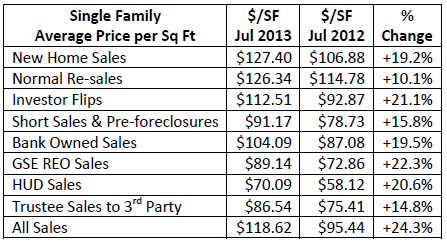 · Normal single family re-sales grew an astonishing 79% from 3,127 in July 2012 to 5,609 in July 2013. Pricing recovery for normal re-sales occurred later than for other sectors, but they have now joined in the overall price increases. The average sales price is up 9%, the median sales price is up 20% and average price per sq. ft. is up 10% over the year. Normal re-sales have increased their market share to 63% from 36% a year ago and are now by far the most numerous type of sale.